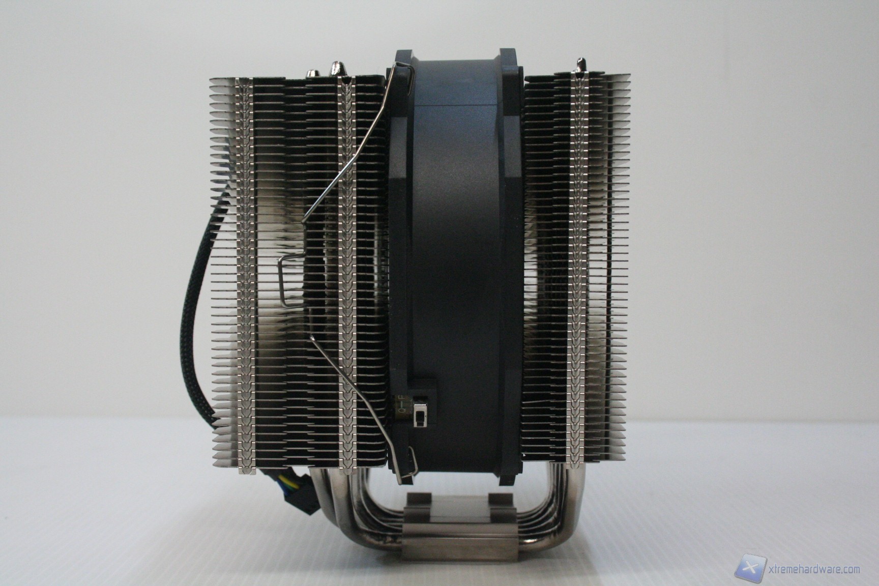 La scudatura finale delle heatpipes è anch’essa nichelata e presenta sia porzioni terminali bombate, sia nude; le heatpipes sono saldate sulle alette e la finitura è molto buona. Presenta una configurazione stock in configurazione push con una ventola da 140x38mm centrale ma è possibile aggiungerne una seconda posteriormente ed una terza anteriormente, quindi si ha a disposizione una soluzione modulare in base alle vostre necessità, ma precisiamo che comunque anche nella configurazione stock si hanno performance molto elevate. La superficie dissipante è elevata e preannunciamo che sarà in grado di gestire CPU decisamente potenti, quindi risulta un eccellente modello anche per CPU dal consumo più contenuto.