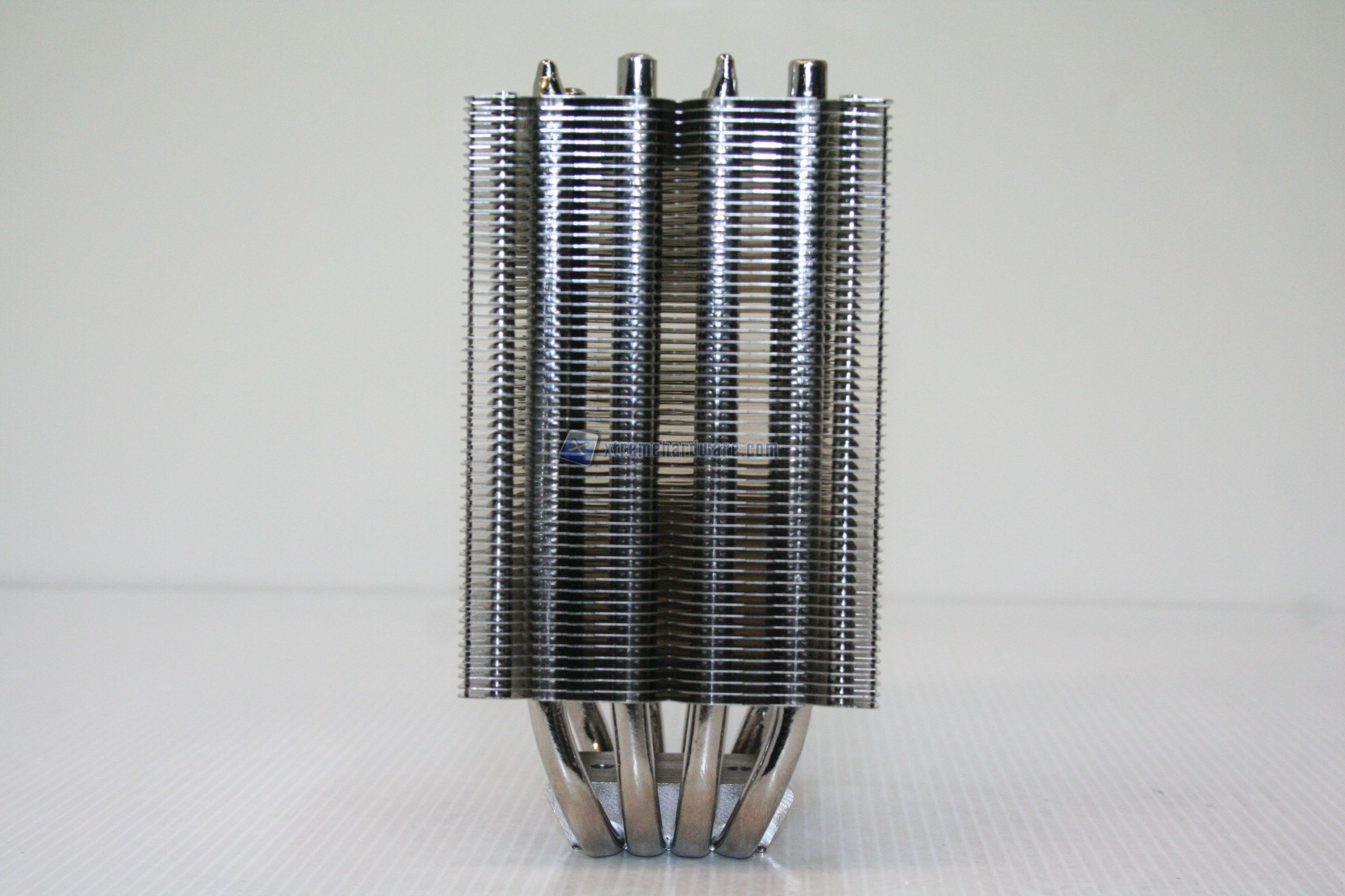 La scudatura finale delle heatpipes è egualmente valida e presenta una configurazione stock Push, anche se purtroppo non è possibile aggiungerne una seconda posteriormente, per via dell’assenza dei fermi nel bundle, similmente al Themis. E’ un modello orientato a gestire una CPU con frequenze medio-alte, con overclock moderati qualora si volesse mantenere una buona silenziosità, ma anche overclock elevati accontentandosi di una soluzione più rumorosa. La superficie dissipante comincia ad essere importante e quindi non ci saranno problemi per la gestione di CPU potenti, con TDP nell’ordine dei 130/160W.